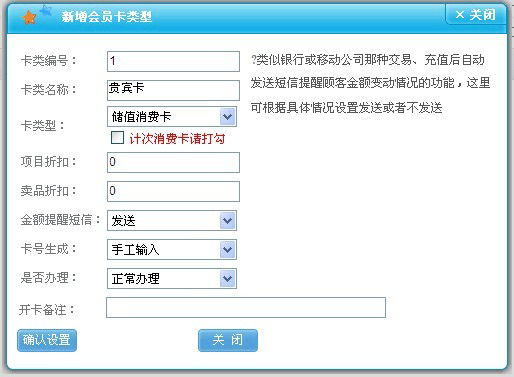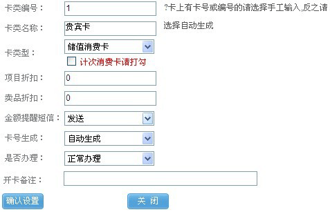 在这里如果我们把这种卡定义为只跟客人打折而不存钱在卡里面,那我们就选择折扣卡,如果只要客人有存钱在卡里面,则选择储值卡。 |