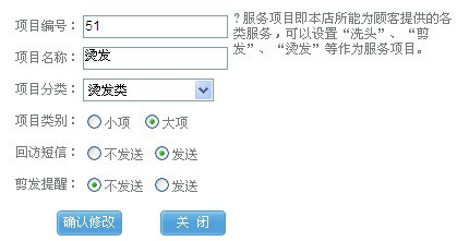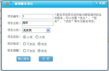 如果是洗吹、洗剪吹、单剪、洗面之类的项目,我们统称为“小项”,如果是烫、染、护之类的项目,我们统称为“大项”,这样设置后我们在报表里面也能清楚的查询到员工所做的小项业绩和大项业绩,更能准确的考核一个发型师的能力。 |