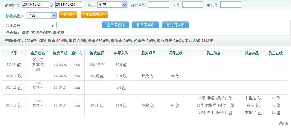 我们通过各种条件组合,可以查询到所有我们想要的数据,比如指定员工、查询日期段、单号、会员卡或手机号,然后点击“查询”按钮即可。 |