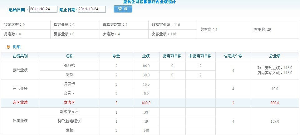 主要是对店内营业收入的一个统计,前台收银员对于“店内业绩统计表”非常重要,因为他的所有收入的金额必须要与系统报表中的数据吻合,如果有误的话,就说明我们的水单数据输入有错误,就必须核对水单。如果水单数据非常多,那我们就分四步来核对,第一步:核对项目消费水单(在运行记录->员工服务记录中查询),第二步:核对卖品消费水单(在运行记录->卖品销售记录中查询),第三步:核对开卡、充值水单(在运行记录->会员充值记录中查询),第四步:核对日常开支数据(在日常开支中查询)。核对完之后如果发现数据输入错误就修改正确,修改完之后再来查看统计报表。