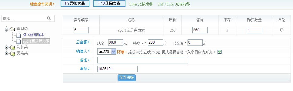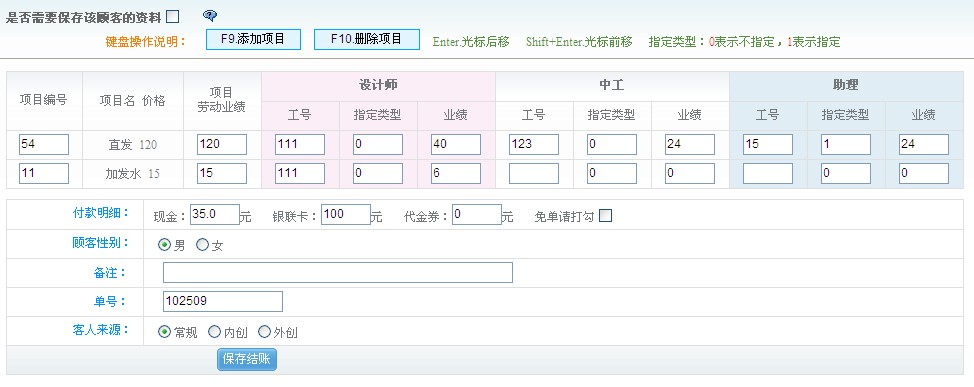 该客人项目消费的总金额,比如说他烫头发120元,洗面20元,那消费金额就是填140元。如果该客人还有购买卖品的话,卖品的金额不包括在这里,卖品的金额应该在“购买产品”这里输入系统。如果该客人是刷银联卡买单,我们只要在“如果是银联刷卡请选择”右边的小框内打勾即可。 |
