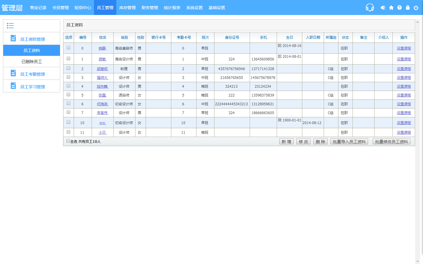 是对我们店里面的员工资料进行统一管理,它主要包括员工的资料、员工的分组、员工考勤等等。