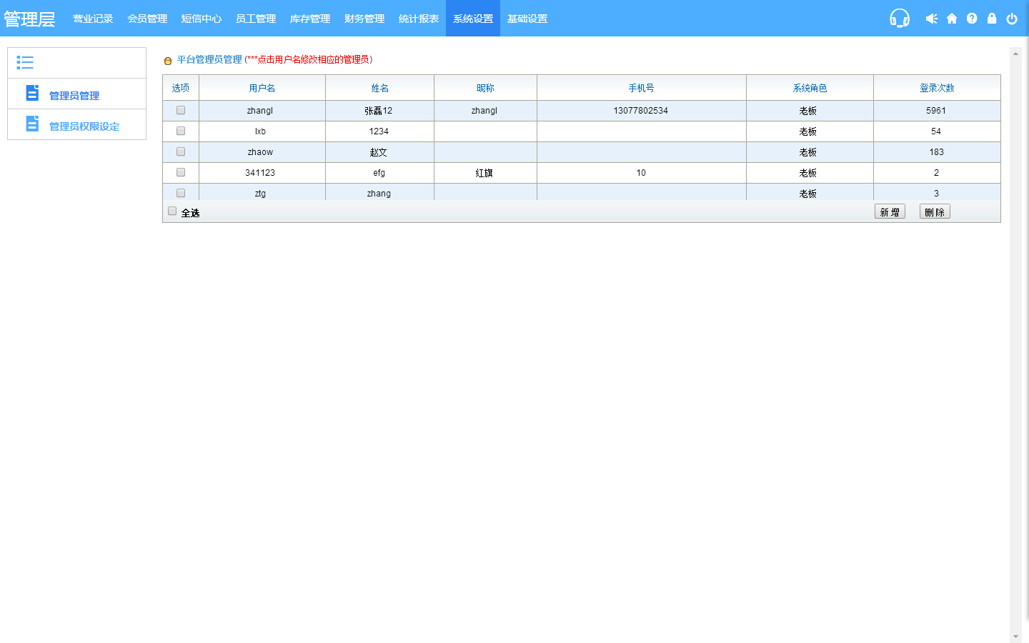 是商户管理层对软件的一个控制,是管理层必须掌握的一个功能之-,因为软件能不能真正使用起来,管理员能不能够舞弊等都是在这里统一控制。比如说添加一个管理员,删除一个管理员,给管理员设置相应的操作权限,查看管理员在系统里面进行了一些什么操作等等。